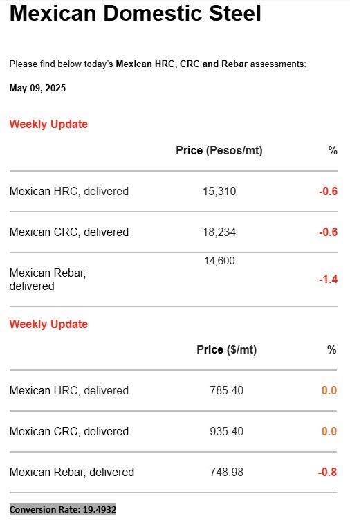 Mientras tanto los precios en México reportados por Platts el 9 de mayo en pesos mexicanos exworks Norte de México presentan descensos de la siguiente manera: