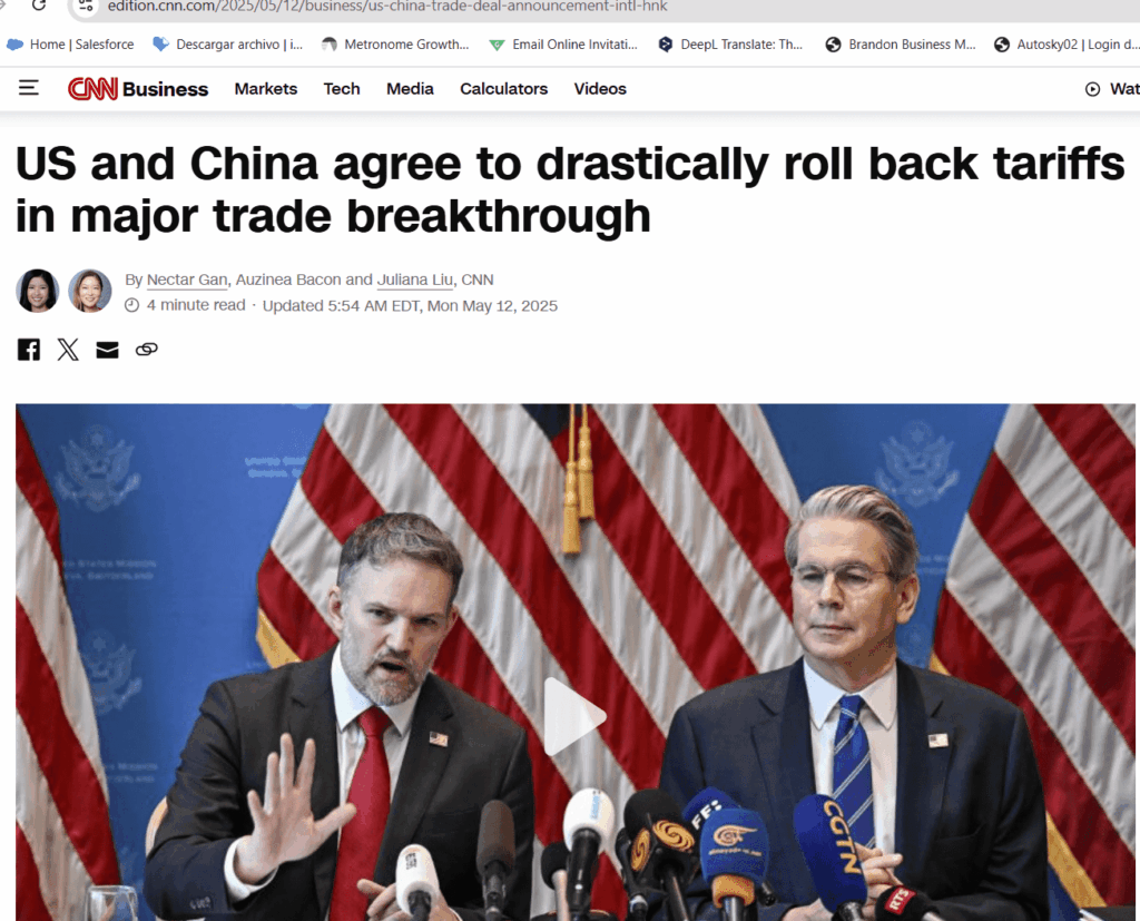 Por otro lado, excelentes noticias para esta pelea que veíamos intermidable. Estados Unidos y China acaban de dar un paso importante para calmar las tensiones en su relación comercial. Después de meses de aranceles cruzados, represalias y negociaciones estancadas, ambas potencias llegaron a un acuerdo inesperado: reducir drásticamente sus aranceles mutuos durante un periodo inicial de 90 días. Este anuncio, que salió tras intensas negociaciones en Ginebra, ya está generando una oleada de optimismo en los mercados globales. Todo esto informado por CNN Business.