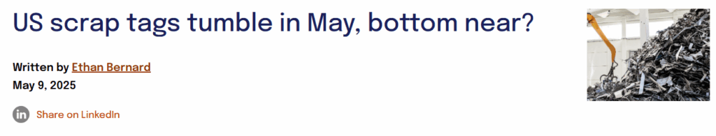 En mayo, los precios de la chatarra en Estados Unidos bajaron de manera generalizada, con caídas entre 30 y 40 dólares por tonelada, e incluso un poco más en algunos casos. Por ejemplo, en la zona de Detroit, algunos tipos de chatarra como el busheling bajaron 40 dólares, el triturado 50 y las chapas estructurales 30.